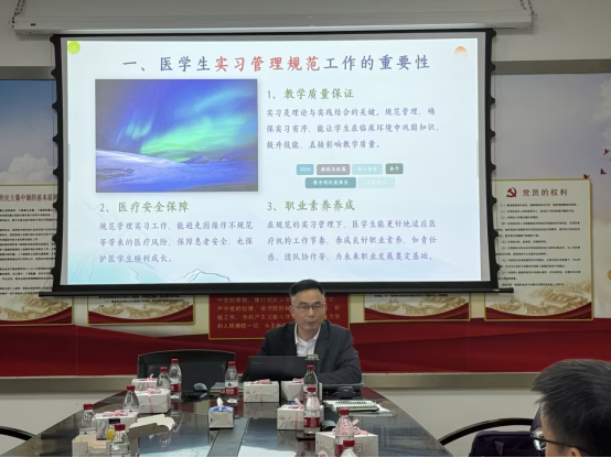 太阳成tyc234cc副院长杨文豪就学院毕业论文和实习作了工作汇报。他介绍了太阳成tyc234cc毕业生实习管理规范和毕业论文(设计)的管理规范。他还对实践教学工作经验总结进行总结,也对未来工作进行了展望。