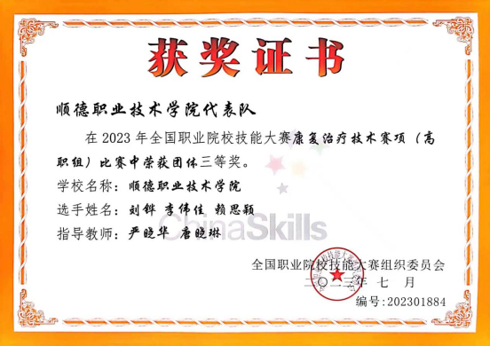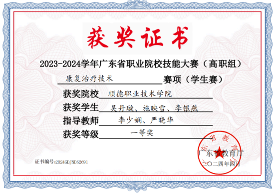 教师的教研科研成果突出,多次获得广东省康复医学会及校级的教学成果奖。参与并独立承担康复治疗技术专业国家教学资源库课程建设一门。迄今为止已有毕业生超过1200名,主要就职于珠三角各家医院、康复中心、养老机构、康复机构等。学生在第一届全国职业技能大赛康复治疗技术赛项中获三等奖,获得广东省职业技能大赛康复治疗技术赛项一等奖3项。第一至第四届全国康复技术大赛(中国康复医学会)获得理论竞赛国家一等奖1项、二等奖2项、三等奖5项;操作竞赛国家三等奖4项。